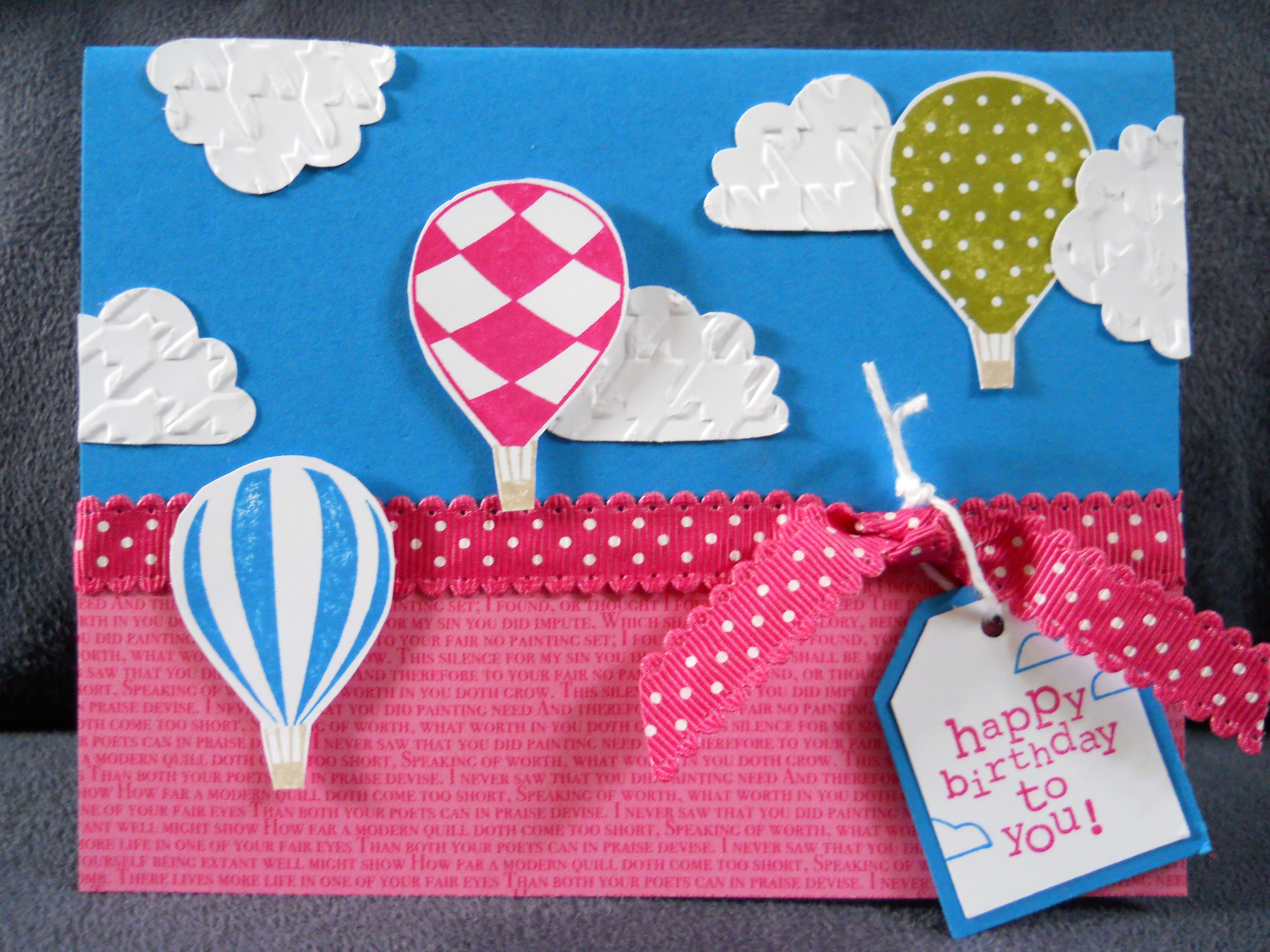 Stamp Set:  Up, Up & Away, p. 63 Colors:  Pacific Point, Melon Mambo, Whisper White, Old Olive Embossing Folder:  Houndstooth Punches:  Cupcake Builder, Large and XL Tag Accessories:  Melon Mambo 1/2″ Scallop Dots Ribbon, White Baker’s Twine, Brights DSP Pad, Dimensionals